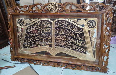 Display of Teak Wood Carved Kaligrafi Calligraphy Surah Kursi Verse Chair Book Carving Frame